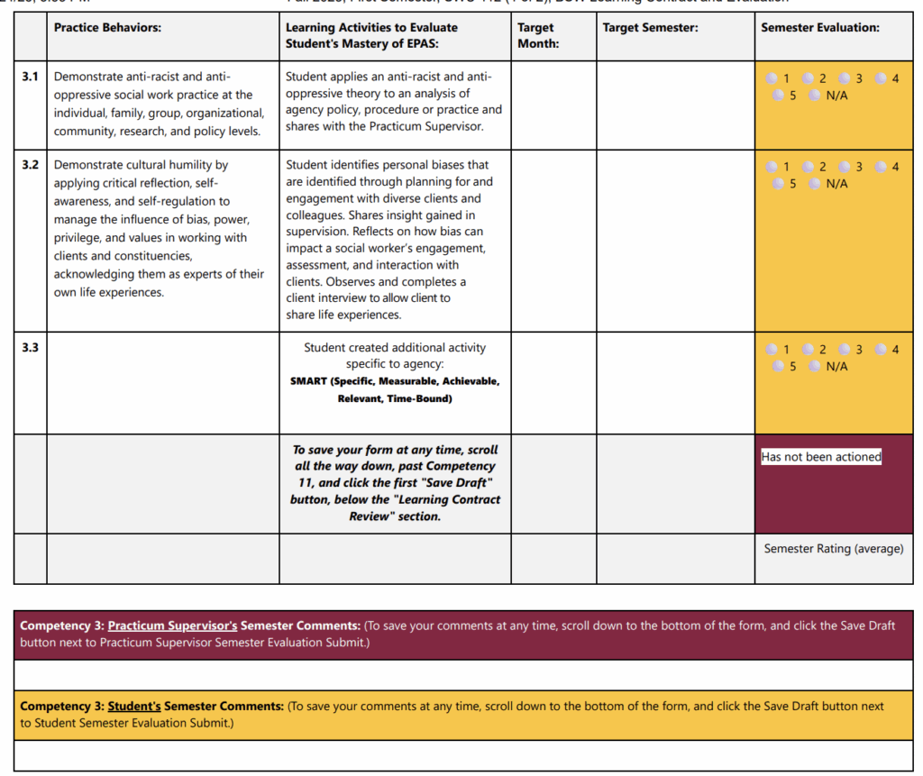 For example, under “Competency 3: Anti-racism, Diversity, Equity, and Inclusion (ADEI) in practice” the student is expected to “demonstrate anti-racist and anti-oppressive social work practice at the individual, family, group, organizational, community, research, and policy levels.” Additionally, the student needs to be able to apply an “anti-racist and anti-oppressive theory to an analysis of agency policy, procedure or practice and shares with the Practicum Supervisor.”
