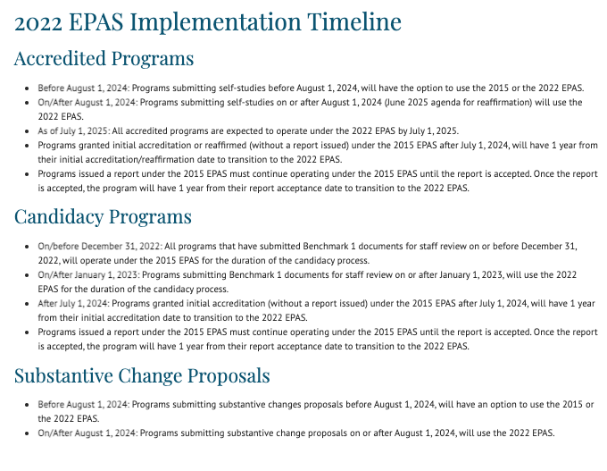 According to CSWE’s 2022 EPAS Implementation Timeline, “all accredited programs are expected to operate under the 2022 EPAS by July 1, 2025.” It continues by stating that “programs granted initial accreditation or reaffirmed (without a report issued) under the 2015 EPAS after July 1, 2024, will have 1 year from their initial accreditation/ reaffirmation date to transition to the 2022 EPAS.”