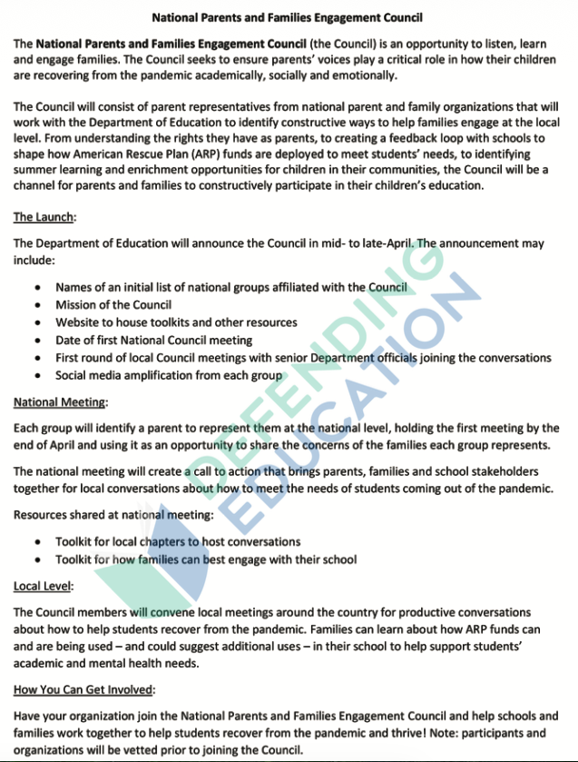 On March 18, 2022, an email sent to select groups titled “Embargoed Document Around Parent and Family Engagement at ED” included information about the “National Parents and Families Engagement Council (the Council)” including an overview of the the Council and its objectives.