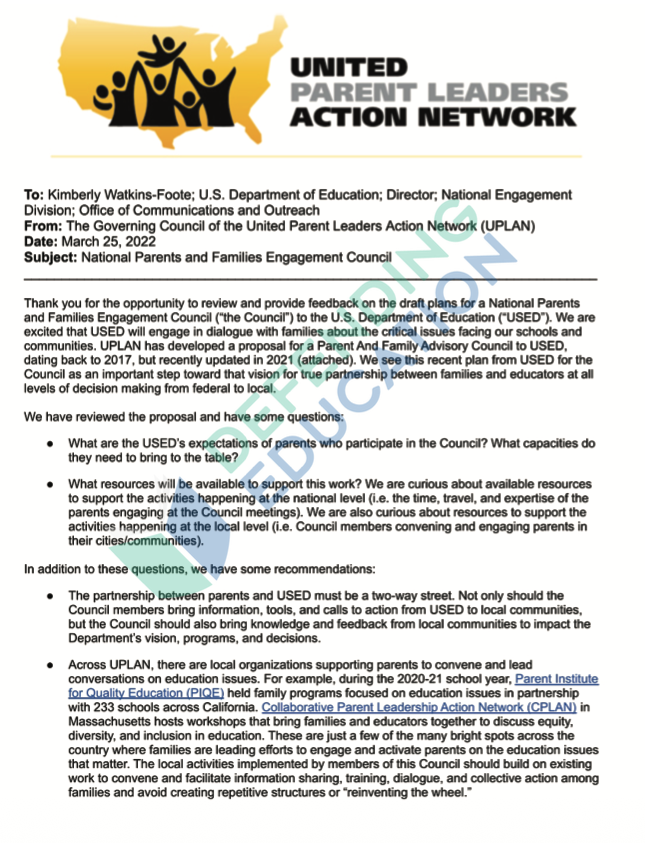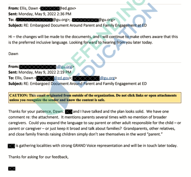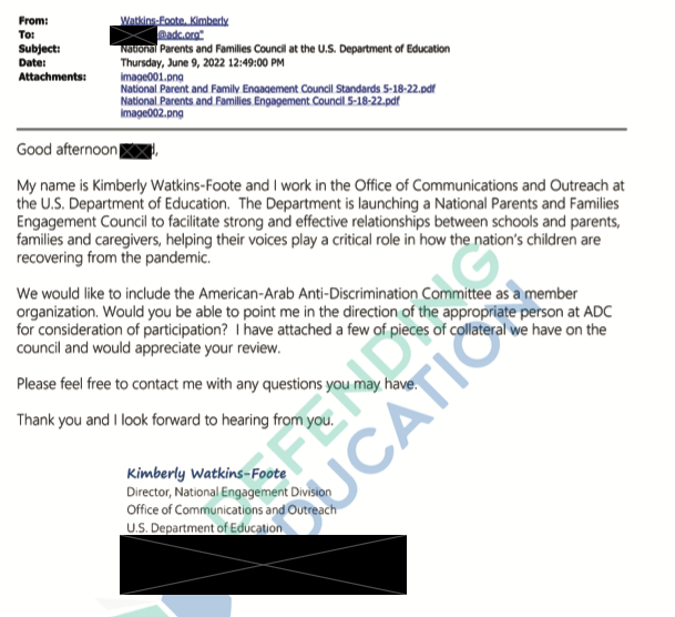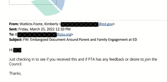 Below are emails from ED to groups invited to supply feedback and to be involved with the National Parents and Families Engagement Council.