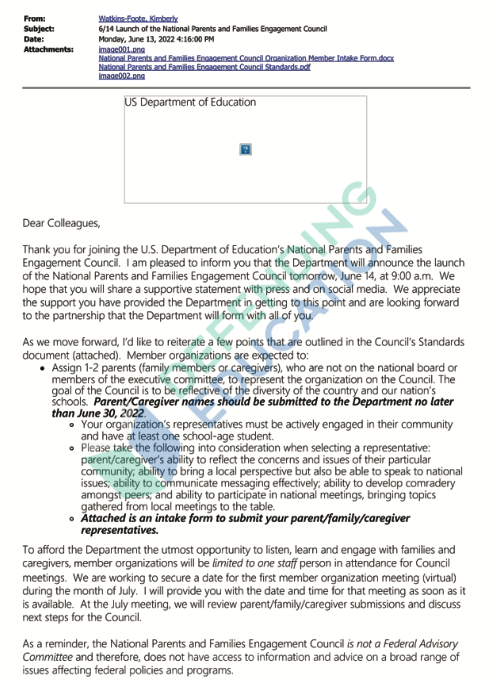 On June 13, 2022, ED sent out an email announcing the launch of the National Parents and Families Engagement Council set for June 14, 2022. The email outlines how member organizations are to select representatives to The Council. The email concludes by stating that it is “not a Federal Advisory Committee and therefore, does not have access to information and advice on a broad range of issues affecting federal policies and programs.”