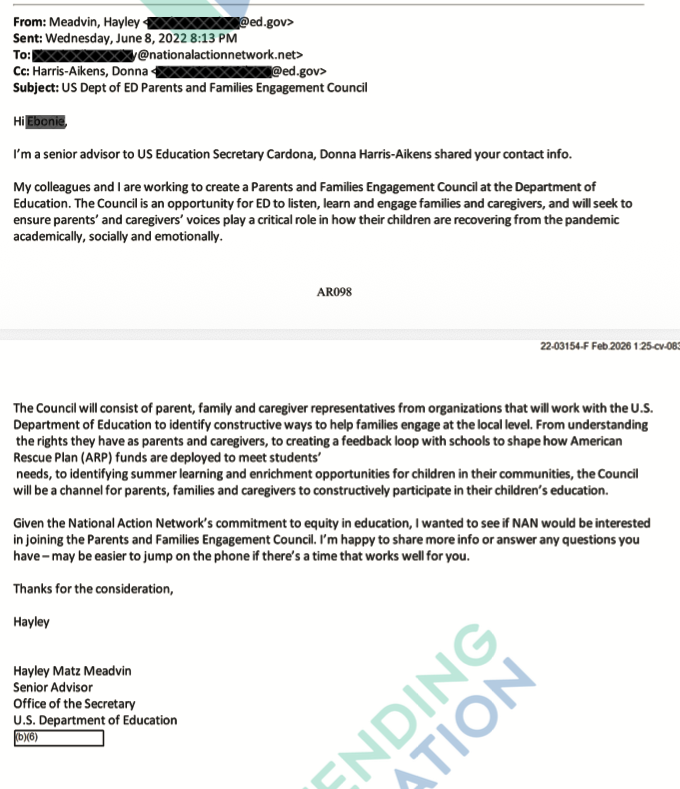 In order to obtain the documents requested through a FOIA, [Parents] Defending Education had to file a lawsuit on March 20, 2025, against the U.S. Department of Education. The following are documents revealing communications related to the disbanded Council.
