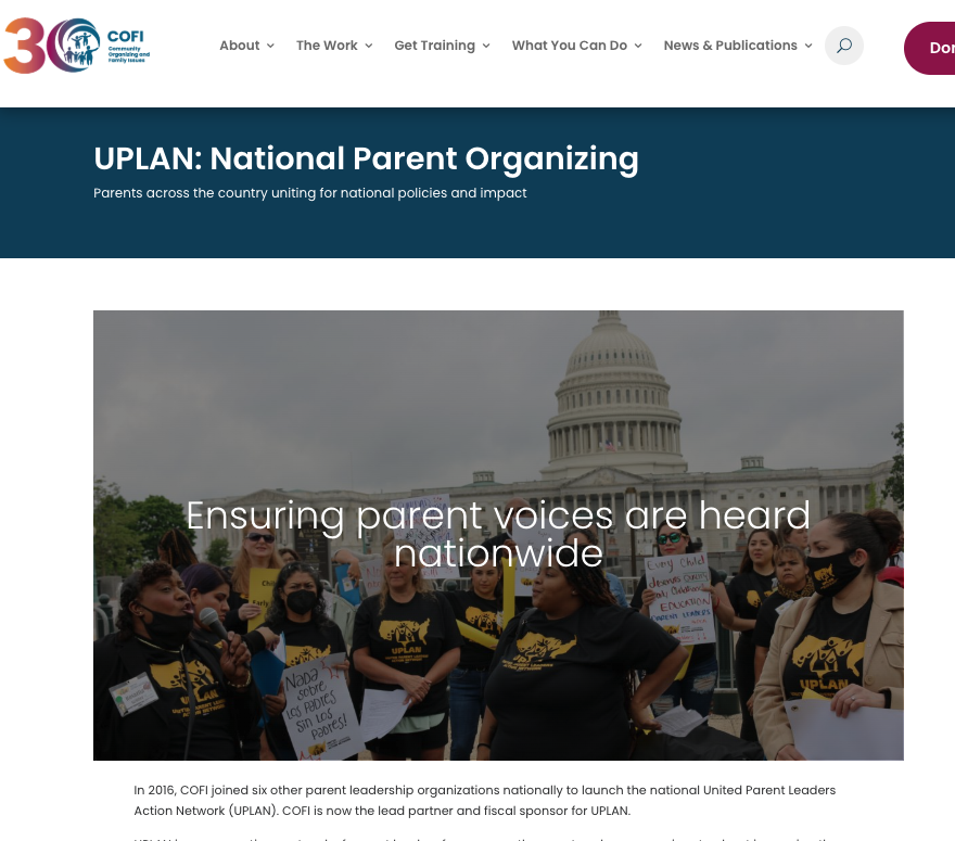 Another group invited to participate on The Council was United Parent Leaders Action Network (UPLAN), which is fiscally sponsored by Community Organizing and Family Issues (COFI). COFI has received roughly $2M in funding since 2021 from nonprofits such as the New Venture Fund, Rockefeller Philanthropy Advisors, and W.K. Kellogg Foundation.