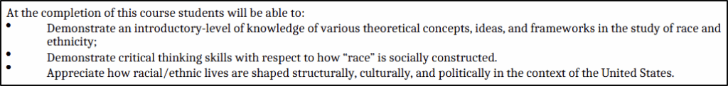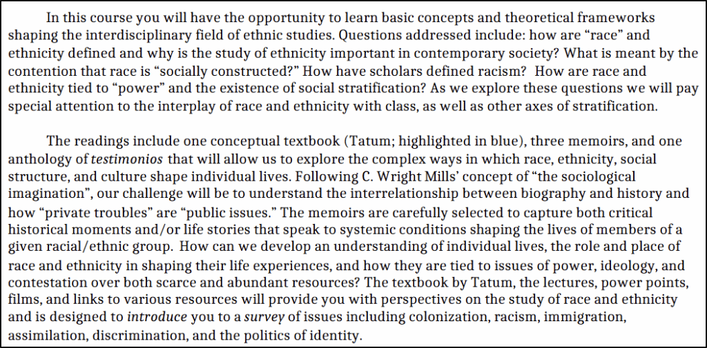 According to a 2019 syllabus, the course studies “colonization, racism, immigration, assimilation, discrimination, and the politics of identity,” as well as how race is “socially constructed.”