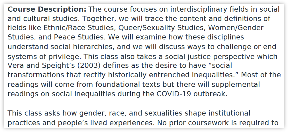 The course focuses on “fields such as American studies, ethnic studies, women and gender studies and Latin American studies” and “examines a range of forms of oppression and privilege from a social justice perspective.”
