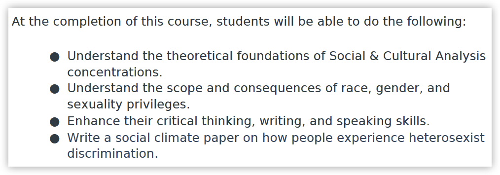 - Students are expected to “understand the scope and consequences of race, gender, and sexuality privileges” and write a “social climate paper on how people experience heterosexist discrimination.”