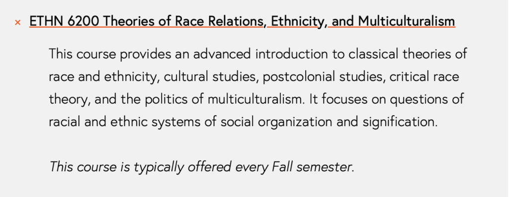 The course ETHN 6800: Critical Race Theory includes topics such as critical race theory, “color-blind privilege,” tenets of queer theory, and whiteness.