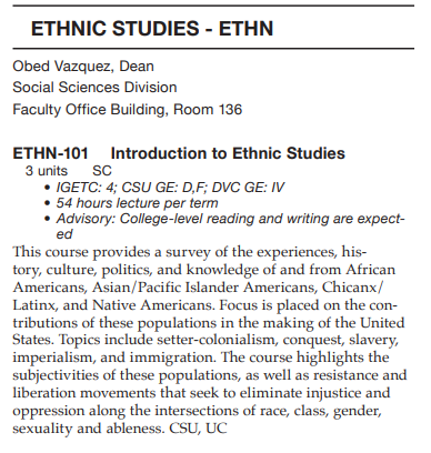 The course description states that it will provide a “survey of the experiences, history, culture, politics, and knowledge of and from African Americans, Asian/Pacific Islander Americans, Chicanx/ Latinx, and Native Americans.”