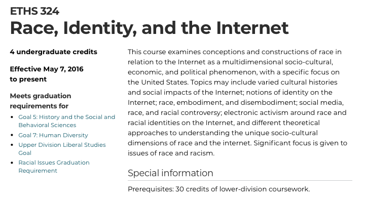 The course “examines conceptions and constructions of race in relation to the Internet as a multidimensional socio-cultural, economic, and political phenomenon, with a specific focus on the United States” and includes “varied cultural histories and social impacts of the Internet; notions of identity on the Internet; race, embodiment, and disembodiment; social media, race, and racial controversy; electronic activism around race and racial identities on the Internet, and different theoretical approaches to understanding the unique socio-cultural dimensions of race and the internet.”