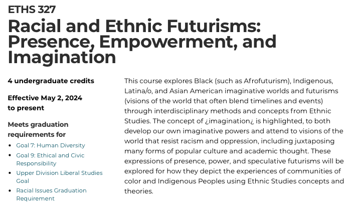 The course “explores Black (such as Afrofuturism), Indigenous, Latina/o, and Asian American imaginative worlds and futurisms (visions of the world that often blend timelines and events) through interdisciplinary methods and concepts from Ethnic Studies.”