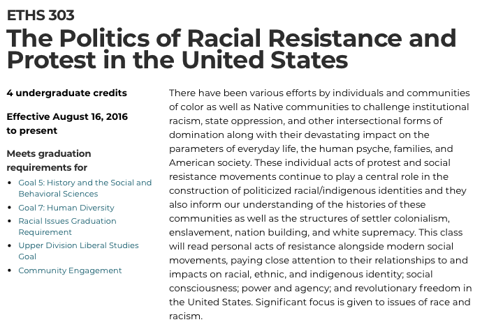The course focuses on the “various efforts by individuals and communities of color as well as Native communities to challenge institutional racism, state oppression, and other intersectional forms of domination along with their devastating impact on the parameters of everyday life, the human psyche, families, and American society” as well as the “individual acts of protest and social resistance movements continue to play a central role in the construction of politicized racial/indigenous identities and they also inform our understanding of the histories of these communities as well as the structures of settler colonialism, enslavement, nation building, and white supremacy.”