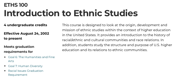 In Introduction to Ethnic Studies, students are taught to be able to define “key terms” such as “race as a social construction, racism, institutional racism, racialization, racial formation, color-blind racism, culture, and ethnicity.”