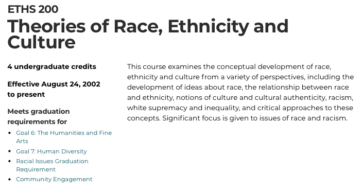 In Theories of Race, Ethnicity and Culture, students are taught the “development of ideas about race, the relationship between race and ethnicity, notions of culture and cultural authenticity, racism, white supremacy and inequality, and critical approaches to these concepts.”