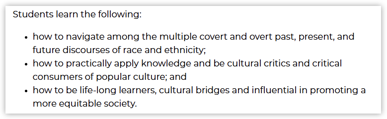 - “Students will … analyze structures of dominance, power, and ideology and the concomitant perpetuation of racial inequality.”