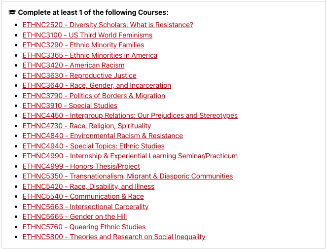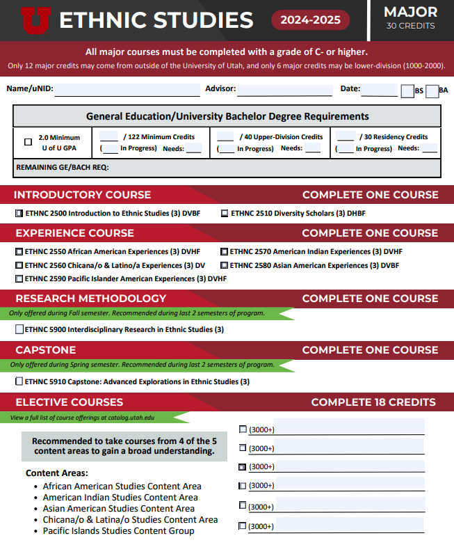 The University of Utah offers an Ethnic Studies major and minor through the School of Cultural & Social Transformation. Students are required to complete one course from each category and eighteen elective courses focused on a specific content area.