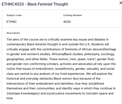 This course aims to “examine key issues and debates in contemporary Black feminist thought in and outside the U.S. Students will critically engage with the contributions of feminists of African descent/heritage to gender and women’s studies, Africana/Black studies, philosophy, sociology, geographies, and other fields” and explores the “historical and everyday obstacles Black womxn face because of the intersections of their embodiment and identities; how they (re)defined themselves and their communities; and identify ways in which they continue to (re)shape knowledge(s) and social justice movements to (re)claim space and time.”