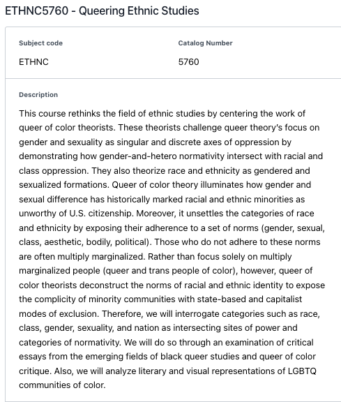This course “rethinks the field of ethnic studies by centering the work of queer of color theorists” and challenging “queer theory’s focus on gender and sexuality as singular and discrete axes of oppression by demonstrating how gender-and-hetero normativity intersect with racial and class oppression.”