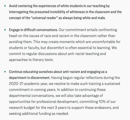The Department lists “steps toward justice” including the acknowledgment of the “centrality of whiteness in the history and evolution of literary canons,” reflecting on “what it means to be called an ‘English Department,’ given the discipline’s roots in imperialism and Eurocentrism,” and “avoid centering the experiences of white students in our teaching by interrogating the presumed invisibility of whiteness in the classroom and the concept of the “universal reader” as always being white and male.”