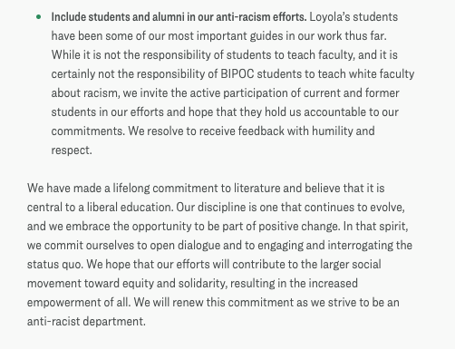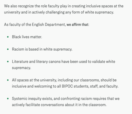 The Department website states that it recognizes the “role faculty play in creating inclusive spaces” and in “actively challenging any form of white supremacy.” It goes on to say that “racism is based in white supremacy” and that the “literature and literary canons have been used to validate white supremacy.”