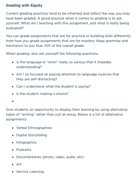 Another section titled “Grading for Equity” states that “current grading practices tend to be inherited and reflect the way you may have been graded.” Instead, the Center suggests focusing less on mechanics and grammar. It also adds that students should be given other opportunities to “display their learning by using alternative types of ‘writing’ rather than just an essay.” Examples of alternative assignments include “Verbal Ethnographies,” “Digital Storytelling,” “Infographics,” “Podcasts,” and “Service Learning.”