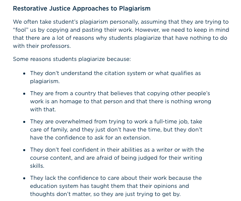 A section titled “Restorative Justice Approaches to Plagiarism” states that faculty need to “keep in mind that there are a lot of reasons why students plagiarize that have nothing to do with their professors” including not understanding the “citation system or what qualifies as plagiarism,” they come from another country where “copying other people’s work is an homage to that person,” they maybe be “overwhelmed from trying to work a full-time job,” or lack confidence.