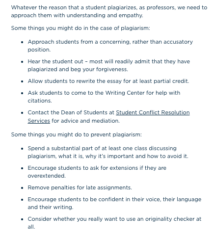 It is also suggested that faculty be preventative by encouraging students to “ask for extensions if they are overextended,” removing “penalties for late assignments,” and to “consider whether you really want to use an originality checker at all.”