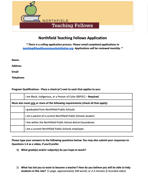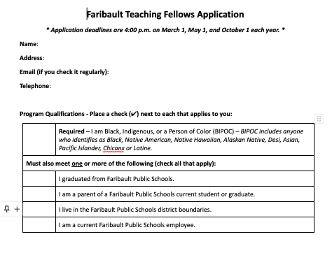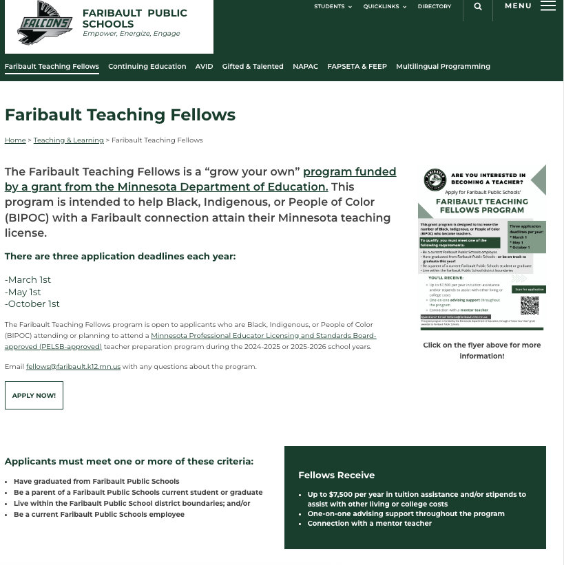 The Northfield Public Schools “Teaching Fellows” program states that it is “intended to help Black, Indigenous, or People of Color (BIPOC) with a Northfield connection attain their Minnesota teaching license.” Per the webpage, the program is “open to applicants who are Black, Indigenous, or People of Color (BIPOC) attending or planning to attend a Minnesota Professional Educator Licensing and Standards Board-approved (PELSB-approved) teacher preparation program.”