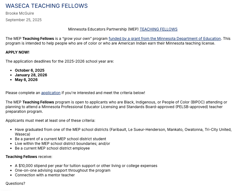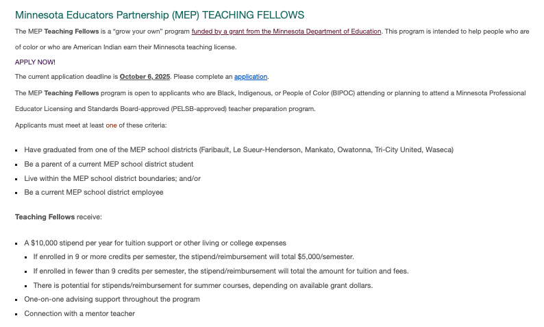 The Waseca Public Schools Teaching Fellows program, part of the Minnesota Educators Partnership (MEP), states that it is “open to applicants who are Black, Indigenous, or People of Color (BIPOC) attending or planning to attend a Minnesota Professional Educator Licensing and Standards Board-approved (PELSB-approved) teacher preparation program.”