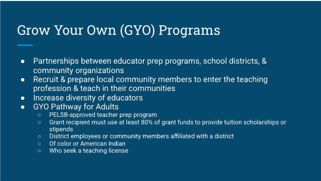 According to a program overview, the GYO pathway is a state approved preparation program funded through the Minnesota’s Department of Education’s Grow Your Own (GYO) Grant Program. Requirements for the program include the use of “at least 80% of grant funds to provide tuition scholarships or stipends,” participants in the program must be “district employees or community members affiliated with a district,” and must be “of color or American Indian.”