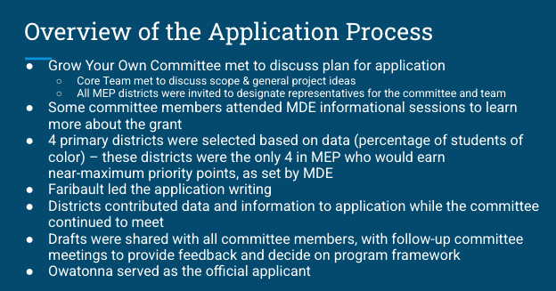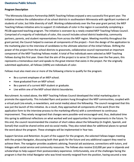According to a press release by Owatonna Public Schools on June 28, 2023, the Minnesota Educators Partnership (MEP) program was awarded two $750,000 grants (for a total of $1.5 million) from the Minnesota Department of Education Grow Your Own (GYO) Grant Program. These GYO programs are intended to “recruit and prepare local community members to enter the teaching profession and return to teach in their communities” and “focused on the enrollments of the member districts with the highest number of students of color, but little diversity of staff.”
