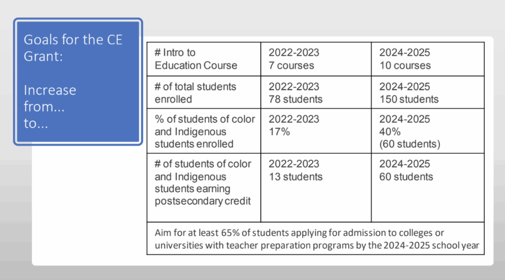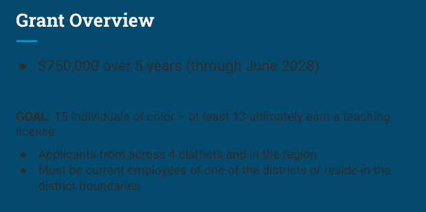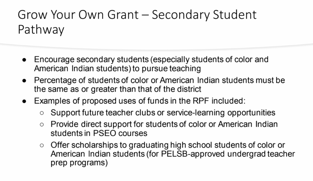 According to a document titled MEP Grants Overview, the secondary student pathway states that the “percentage of students of color or American Indian students must be the same as or greater than that of the district.” Proposed use of funds include offering “scholarships to graduating high schools students of color or American Indian students (for PSELB-approved undergrad teacher prep programs).”