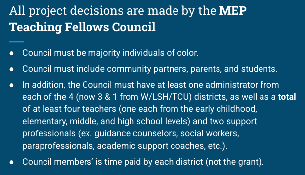 Per the document, “all project decisions are made by the MEP Teaching Fellows Council” which “must be majority individuals of color,” must “include community partners, parents, and students,” and must have administrators, teachers, and support professionals from each district involved.