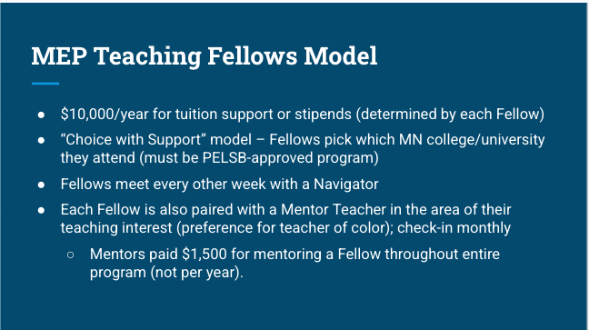 An overview of the process states that participating districts in the $750,000 grant funded program were “selected based on data (percentage of students of color)” and that the goal is for at least thirteen “individuals of color” to earn a teaching license within the five-year period. The “MEP Teaching Fellows Model” includes “$10,000/ year for tuition support or stipends,” acceptance into the Minnesota college or university of choice, and also “paired with a Mentor Teacher in the area of their teaching interest (preference for teacher of color).” Mentors are “paid $1,500 for mentoring a Fellow throughout entire program.”