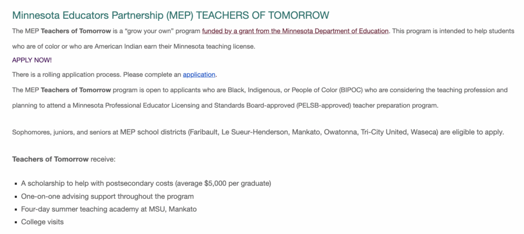 The Minnesota Educators Partnership (MEP) “Teachers of Tomorrow” program states that it is “intended to help students who are of color or who are American Indian earn their Minnesota teaching license.” The program is “open to applicants who are Black, Indigenous, or People of Color (BIPOC) who are considering the teaching profession and planning to attend a Minnesota Professional Educator Licensing and Standards Board-approved (PELSB-approved) teacher preparation program.”