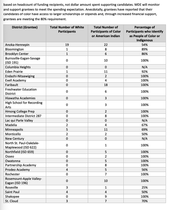 According to a 2024 Minnesota Department of Education report on “Grow Your Own” programs, the document data reveals that partnership districts (Faribault, Northfield, and Owatonna – which includes Mankato) featured 100% of their participants identifying as “People of Color or Indigenous.” The document did not include data from the other districts involved in the MEP.