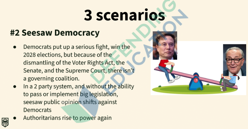 The second scenario labeled “Seesaw Democracy” states that “Democrats put up a serious fight, win the 2028 elections, but because of the dismantling of the Voter Rights Act, the Senate, and the Supreme Court, there isn’t a governing coalition.” It also includes that in a “2 party system, and without the ability to pass or implement big legislation, seesaw public opinion shifts against Democrats” and that “Authoritarians rise to power again.”