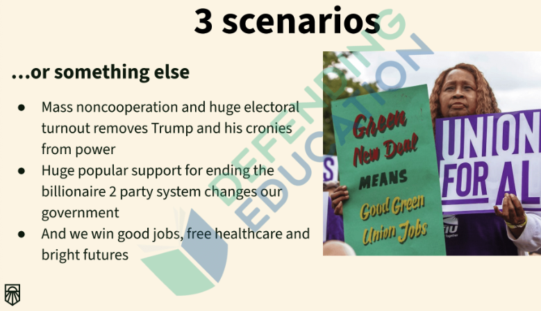 The third scenario offers the organization’s desired outcome which is “mass noncooperation and huge electoral turnout removes Trump and his cronies from power,” there is “huge popular support for ending the billionaire 2 party system changes our government,” and “we win good jobs, free healthcare and bright futures.”