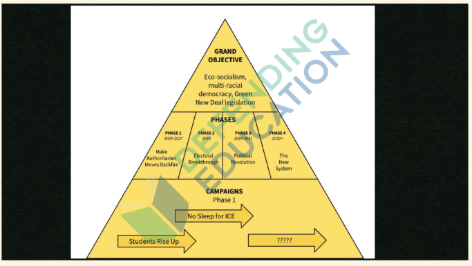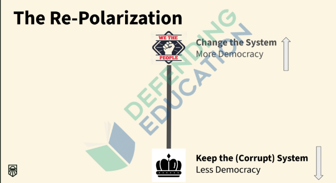 The organization’s slides state that to “get majority of society out in the streets and an explosion in voting, we need to repolarize society.” Which is defined as “fighting for hearts and minds – a rainbow coalition of the multiracial working class” that moves away from a “(corrupt) system” to a changed system with “more democracy.”
