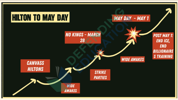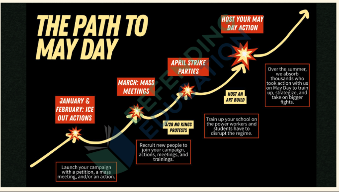 The slide presentation from the organization includes a timeline for action and tactical escalation beginning with the March 28, 2026, “No Kings” event and May Day national mass noncooperation strike and protest.