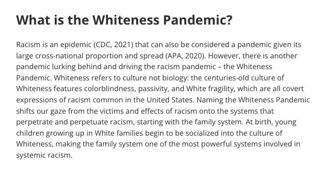 Naming the Whiteness Pandemic shifts our gaze from the victims and effects of racism onto the systems that perpetrate and perpetuate racism, starting with the family system. At birth, young children growing up in White families begin to be socialized into the culture of Whiteness, making the family system one of the most powerful systems involved in systemic racism.