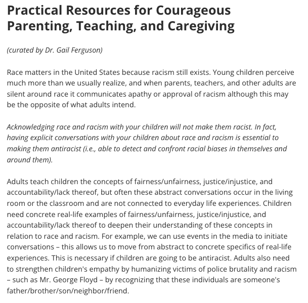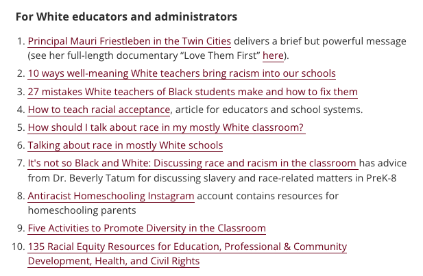 The site lists other resources for White parents and White teachers such as works from Ibram X. Kendi and Robin DiAngelo.