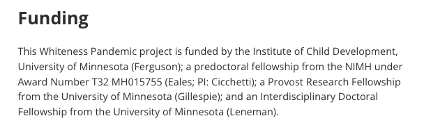 The University of Minnesota – Twin Cities’ ‘Culture and Family Life Lab’ features pages on ‘Whiteness Pandemic’; National Institute of Mental Health is one of funding sources