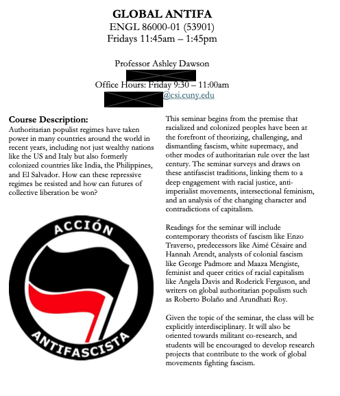 A City University of New York (CUNY) Graduate Center English course titled “Global Antifa” focuses on “militant co-research” and students developing their own “research projects that contribute to the work of global movements fighting fascism.”