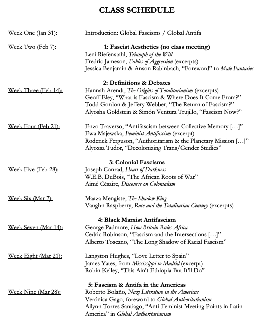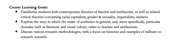 Course learning goals include familiarizing “students with contemporary theories of fascism and antifascism, as well as related critical theories concerning racial capitalism, gender & sexuality, imperialism, etcetera,” exploring the “ways in which the realm of aesthetics in general, and, more specifically, particular domains such as literature and visual culture, relate to fascism and antifascism,” and discussing “various research methodologies, with a focus on histories and examples of militant co-research research.: