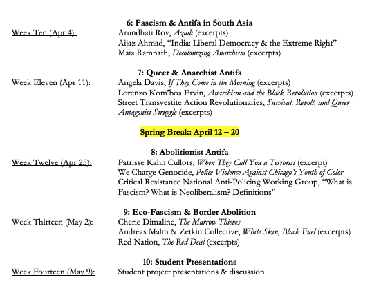 Course texts include a collection of far-left readings on “Colonial Fascisms,” “Black Marxist Antifascism,” “Queer Antifa,” and “Eco-Fascism and Border Abolition.” Students will also read excerpts from Angela Davis, Patrisse Kahn Cullors, and Street Transvestite Action Revolutionaries.