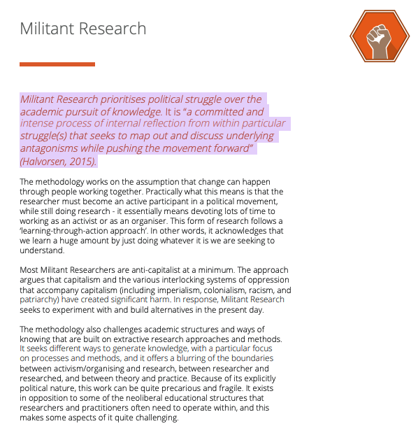 According to an academic paper, Militant Research, or Co-Research, is a collaborative methodology where the “researcher must become an active participant in a political movement, while still doing research – it essentially means devoting lots of time to working as an activist or as an organiser.” It also “challenges academic structures and ways of knowing that are built on extractive research approaches and methods” and “seeks different ways to generate knowledge, with a particular focus on processes and methods, and it offers a blurring of the boundaries between activism/organising and research, between researcher and researched, and between theory and practice.”